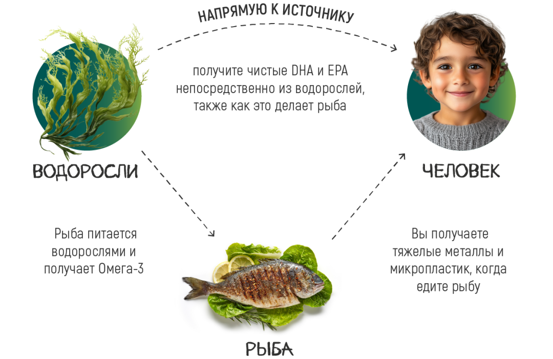 НАПРЯМУЮ К ИСТОЧНИКУ – получите чистые DHA и EPA непосредственно из водорослей, также как это делают рыбы.